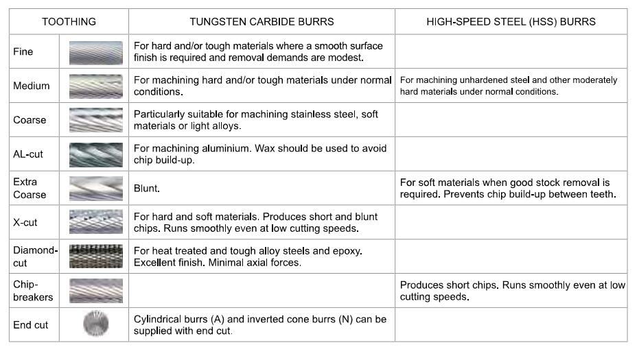 The burrs are manufactured in two different materials, tungsten carbide or high-speed steel. The choice of material depends on the application.